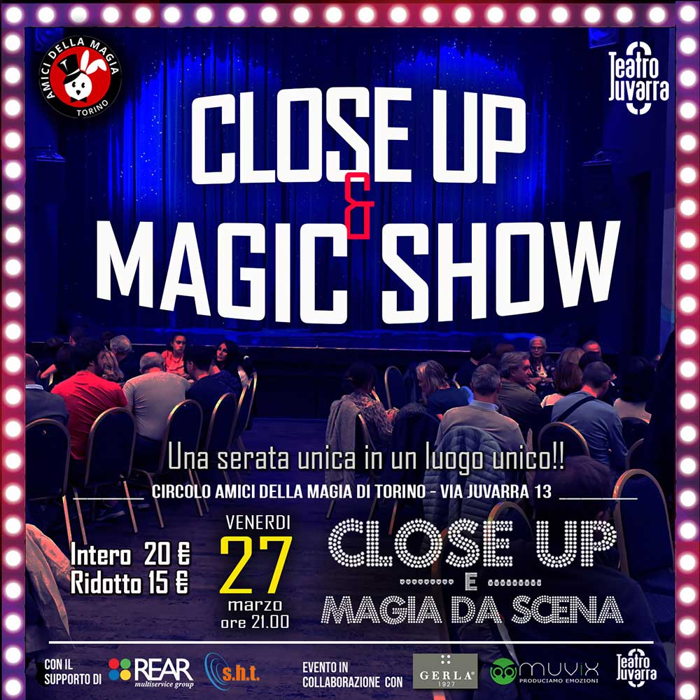 Venerdì 27 marzo 2026 alle 21.00 una speciale serata al Teatro Juvarra con lo spettacolo di Close Up e Magia da Scena il formato unico che caratterizza il nostro circolo torinese.
