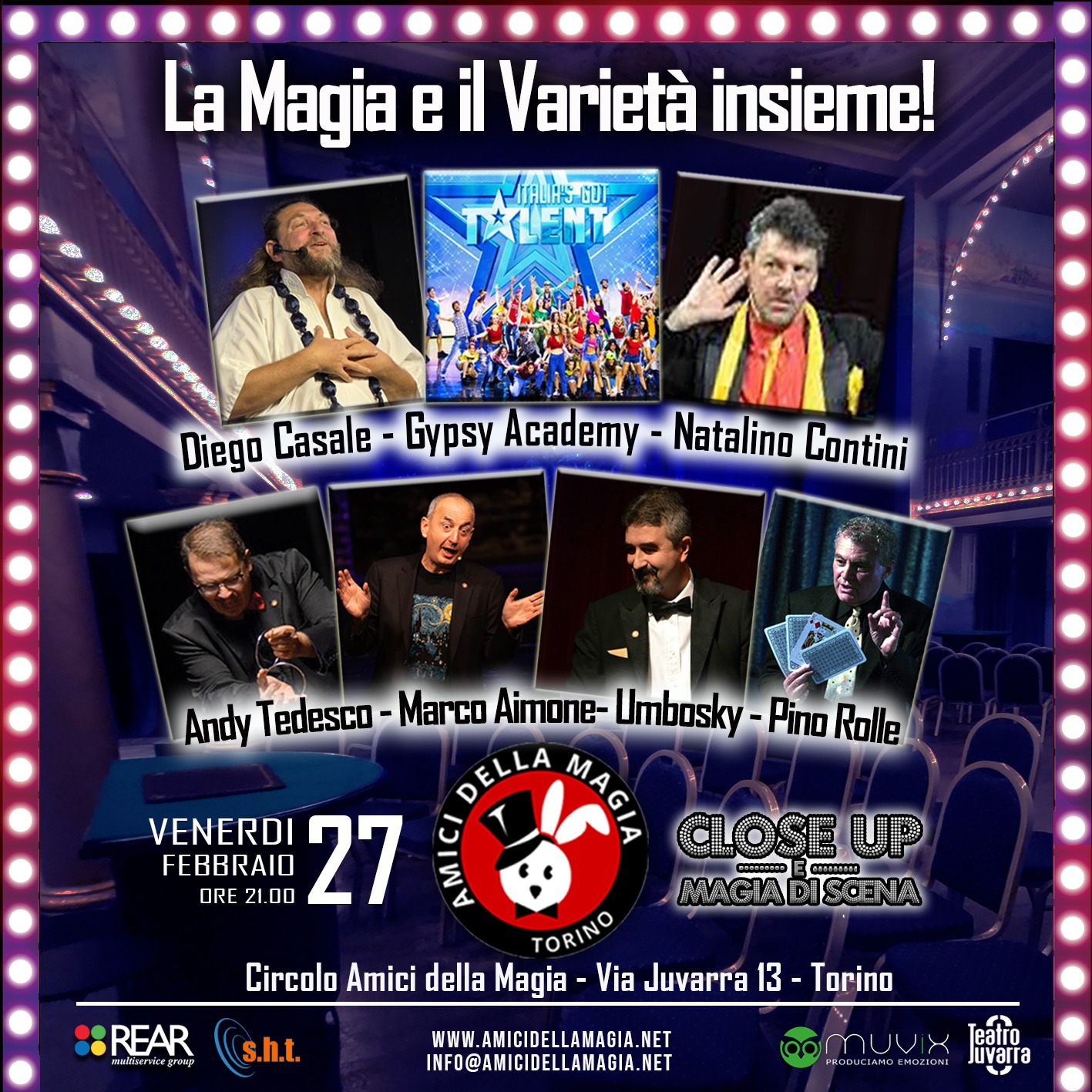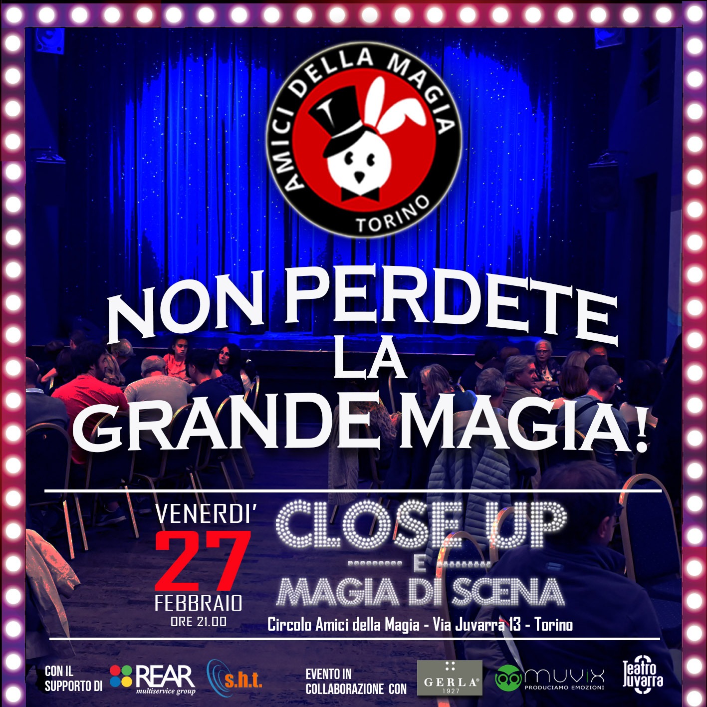 Venerdì 27 febbraio 2026 alle 21.00 una speciale serata al Teatro Juvarra con lo spettacolo di Close Up e Magia da Scena il formato unico che caratterizza il nostro circolo torinese.