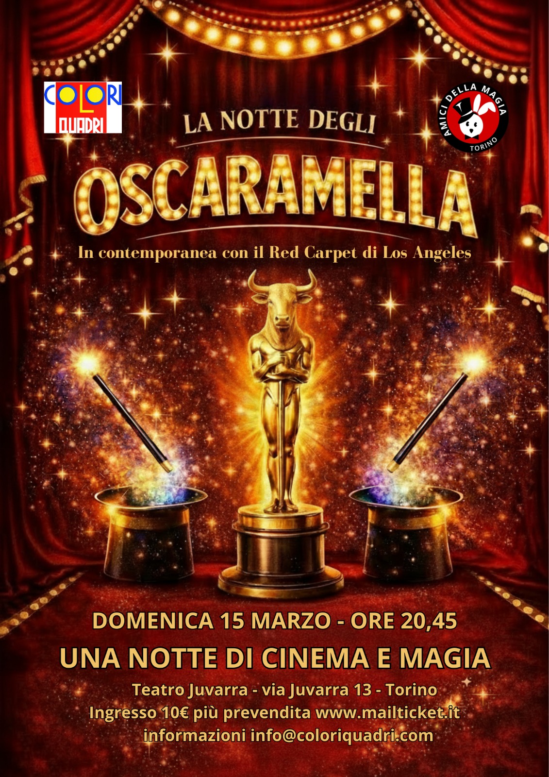 La serata, con la collaborazione del Circolo Amici della Magia e in contemporanea con la Notte degli Oscar a Los Angeles, prevede una divertente commistione fra cinema e magia, alternando la proiezione dei cortometraggi premiati e interventi dell’illusionista Marco Aimone che incanteranno il pubblico. Con alcune piccole sorprese…